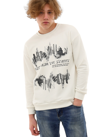 Свитшот детский с рисунком - стильная и практичная одежда для мальчика. Эта кофточка из футера идеально подойдет для школьных будней или спортивных занятий. Она оверсайз, поэтому отлично подойдет как подросткам, так и младшим юношам. Свитшот выполнен из футера петля в спортивном стиле с актуальным принтом.  Преобладание хлопка делает его мягким и комфортным на ощупь. Этот модный джемпер с манжетами и поясом из мягкого кашкорсе, что придает ему особый шик. Однотонная школьная кофта выглядит стильно благодаря интересному рисунку в виде разноцветных букв на полочке.