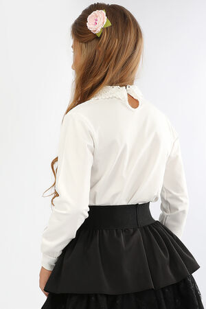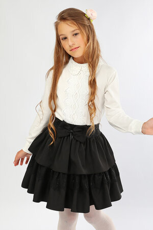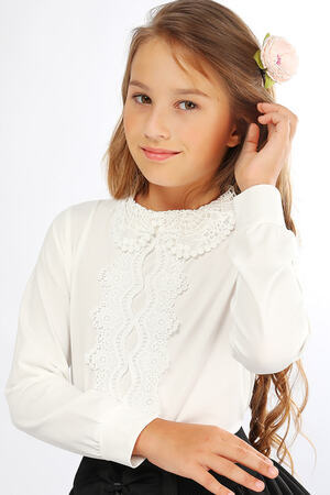 Элегантная блузка прямого силуэта для девочки. Передняя часть декорирована кружевом, отложной воротник также выполнен из кружева. Мягкий, приятный к телу трикотаж, обеспечит идеальную посадку изделия по фигуре. На спинке застёжка-пуговица. Прекрасный выбор для создания красивого школьного образа.