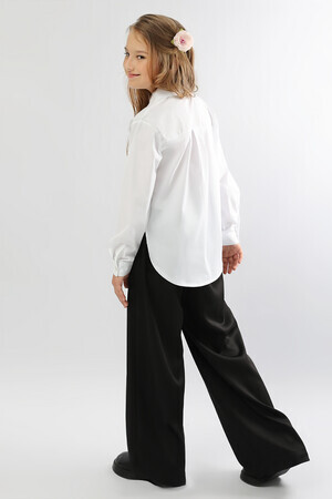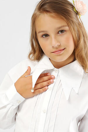 Блузка для девочки Соль&Перец, на пуговицах, с удлинённой спинкой. Отложной, фигурный воротник декоирован бусиной со стразами. Пуговицы украшены золотистыми вставками. Ткань-бенгалин. Эластан, входящий в состав материала, обеспечит идеальную посадку изделия по фигуре. Классический элемент школьной формы прекрасно дополнит гардероб каждой девочки.