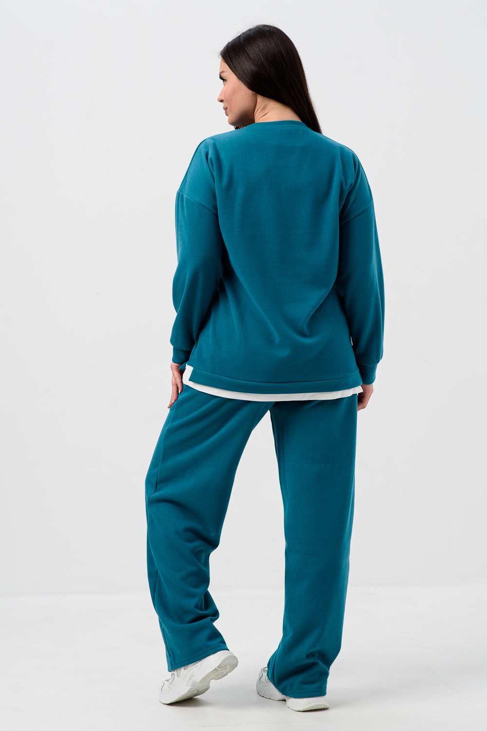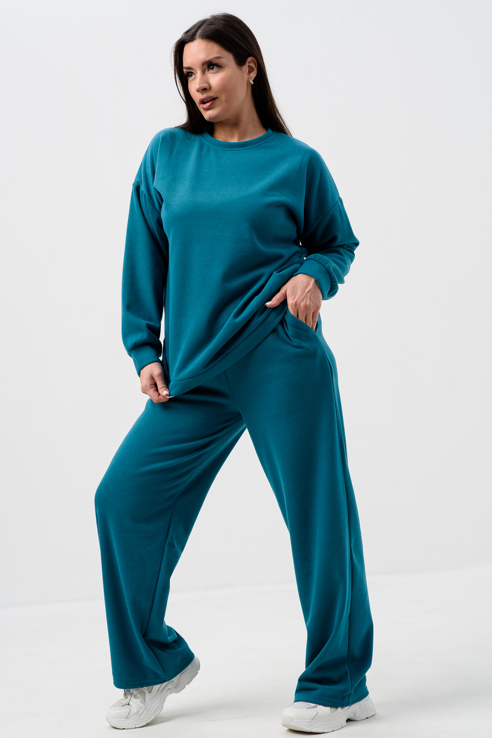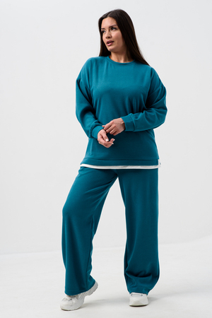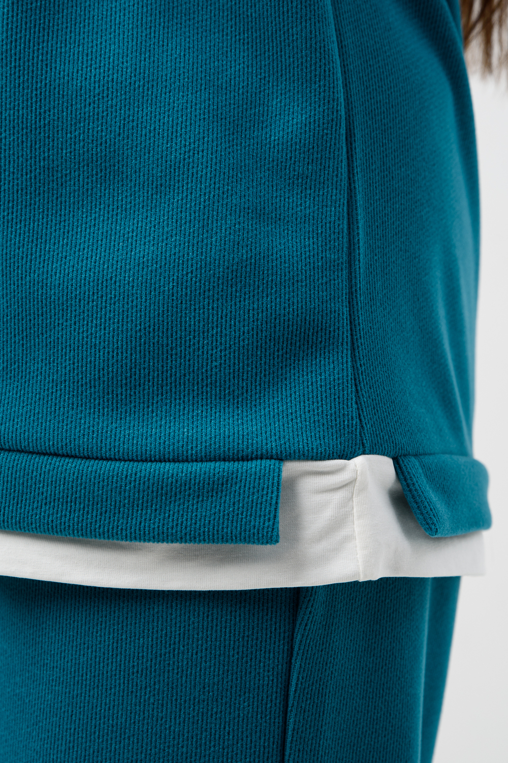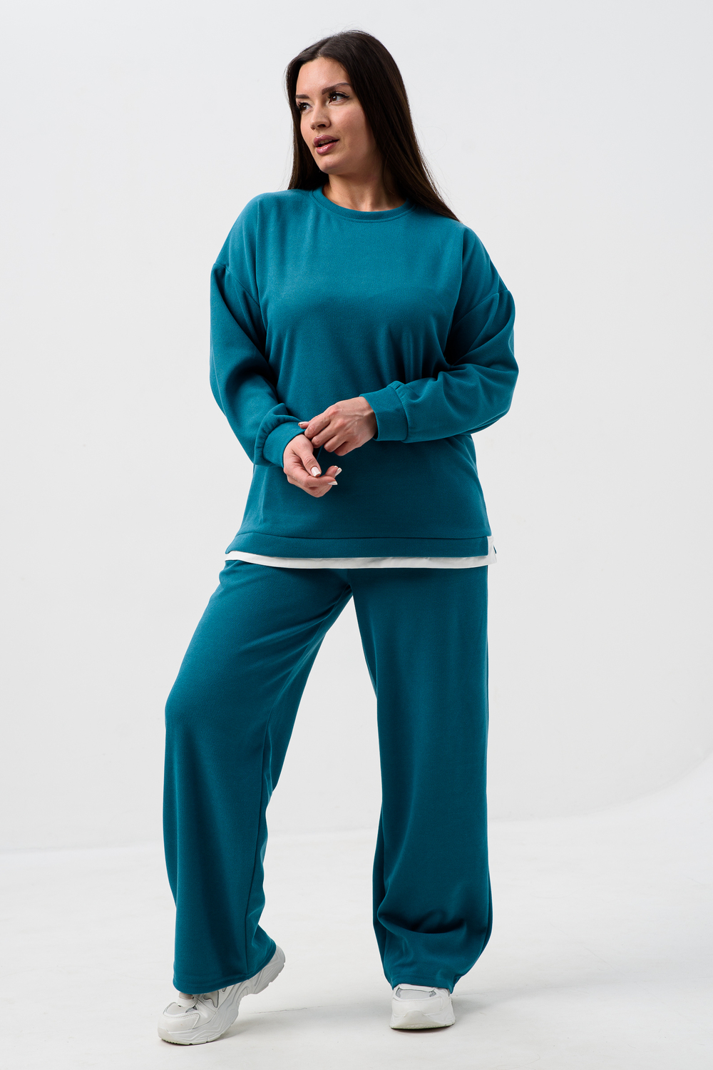 Женский костюм из мягкой, фактурной и приятной ткани. Вверх - худи оверсайз со спущенным рукавом и округлой горловиной, понизу обманка - иллюзия футболки, которая придает современный стиль двойке, низ - свободные и прямые брюки палаццо, по бокам карманы, пояс на резинке. Костюм идеально подходит для повседневной носки.