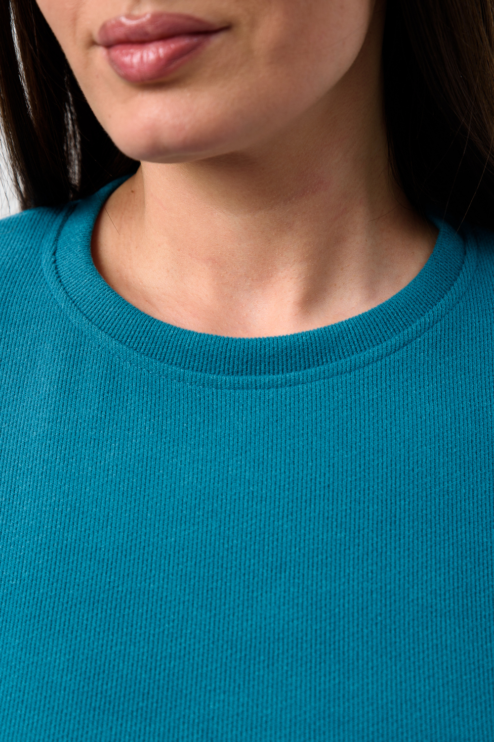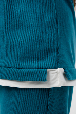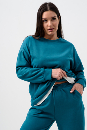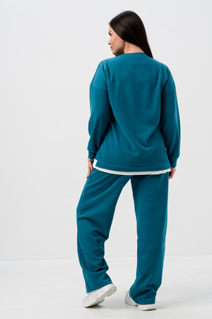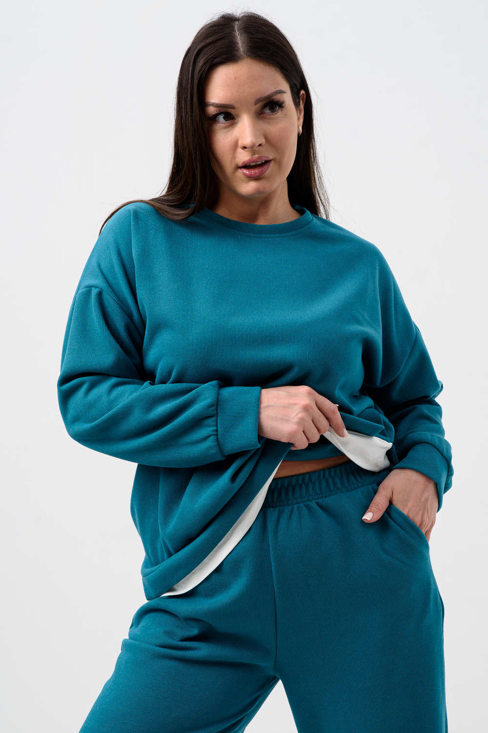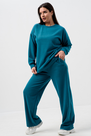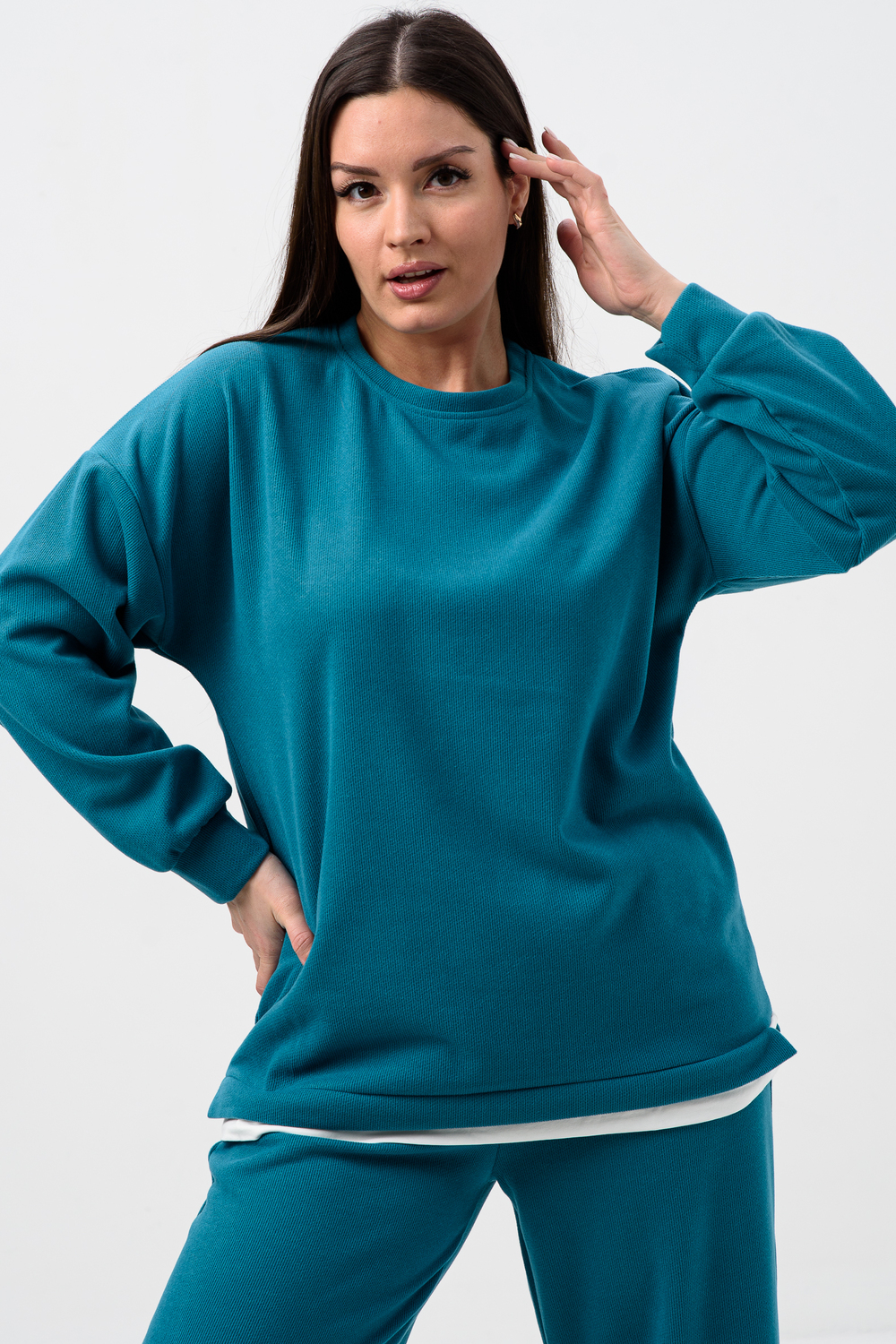 Женский костюм из мягкой, фактурной и приятной ткани. Вверх - худи оверсайз со спущенным рукавом и округлой горловиной, понизу обманка - иллюзия футболки, которая придает современный стиль двойке, низ - свободные и прямые брюки палаццо, по бокам карманы, пояс на резинке. Костюм идеально подходит для повседневной носки.