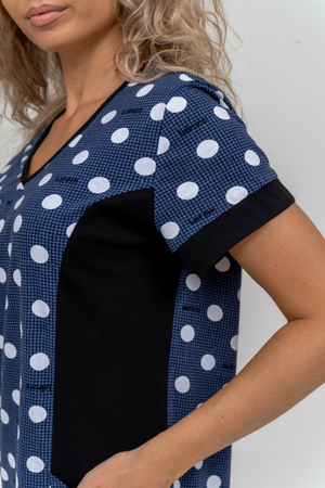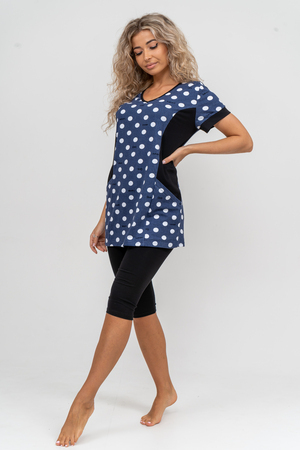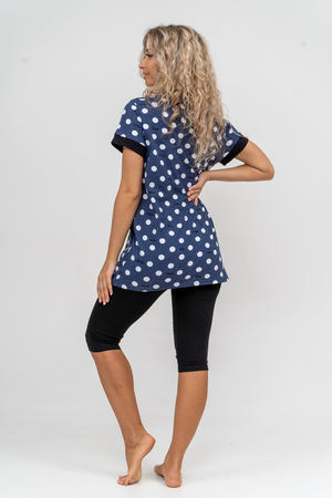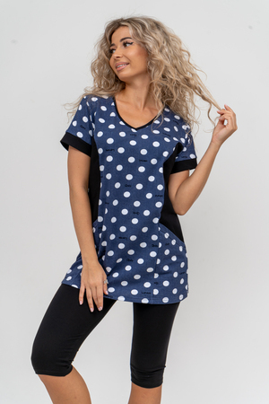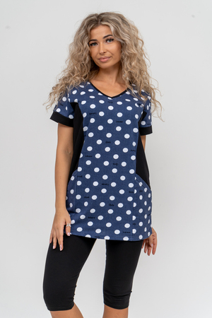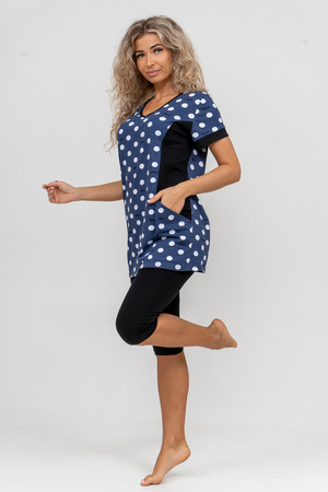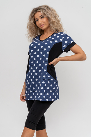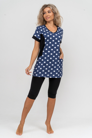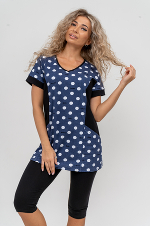 Женский костюм полуприлегающего силуэта состоит из туники и бриджей. 100% дышащий хлопок туники и эластичная вискоза бриджей несут в себе удобство при носке, гигроскопичность и износостойкость. V-образный вырез горловины придаёт изделию женственный вид. Для удобства туника имеет вместительные накладные карманы и втачные рукава с манжетами. Рельефы на полочке изделия создают идеальную посадку и безупречный внешний вид. Бриджи на резинке с высокой посадкой. В костюме такого плана Вы будете чувствовать себя комфортно как дома, так и на любимой даче. Эта двойка идеально подойдет для летнего отдыха на даче, на море или просто для девушек, которые хотят чувствовать себя уютно и комфортно дома. Летний женский костюм подходит для поездок и путешествий, загородного отдыха на природе, а также для получения лечения в больнице или санатории. Повседневное хлопковое изделие с бриджами - отличная идея для подарка любимой жене, маме, сестре или подруге на день рождения, 8 Марта или по любому другому приятному поводу. Рекомендация: для того чтобы продлить яркую жизнь Вашему костюму для дома и отдыха из хлопка, стирку производить при температуре не выше 30 градусов, а во избежание деформации изделия не прибегать к ручному отжиму (не перекручивать), утюжить слегка недосушенное изделие утюгом на паровом режиме. Покупайте наши красивые и удобные домашние костюмы с бриджами и носите с удовольствием! Приятных покупок!