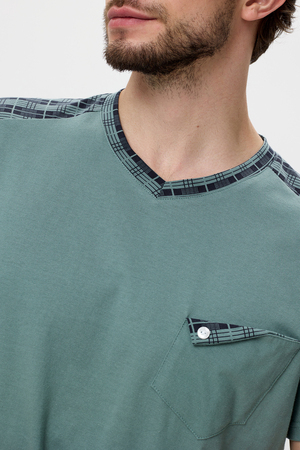 Домашний мужской комплект от бренда Lika Dress - идеальный вариант для отдыха, для сна и других домашних активностей. Комплект состоит из удобных и стильных клетчатых шорт, а также однотонной футболки с карманом на груди и V-образным вырезом с окантовкой в цвет шорт. Наш костюм сшит из нежного и качественного трикотажа - кулирки. Поэтому ткань дышит, не электризуется, не вызывает раздражения и прекрасно впитывает влагу.