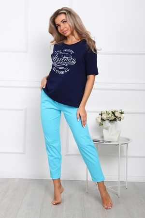 Пижама женская: футболка с короткими рукавами с принтом на полочке, брюки разных расцветок с боковыми карманами.