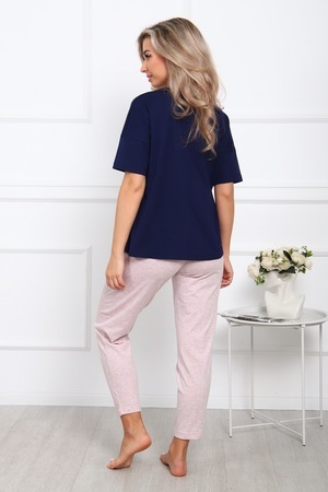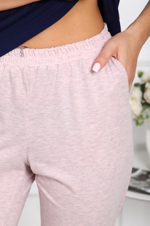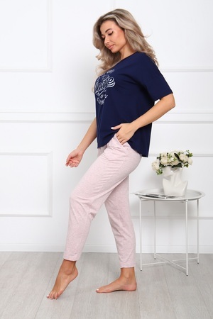 Пижама женская: футболка с короткими рукавами с принтом на полочке, брюки разных расцветок с боковыми карманами.