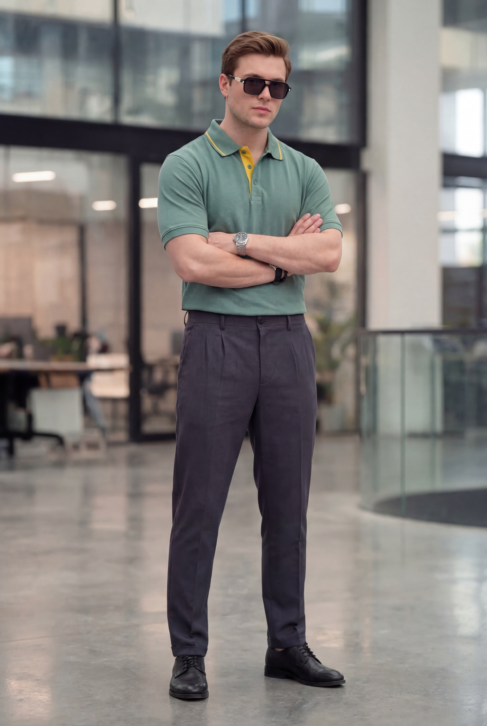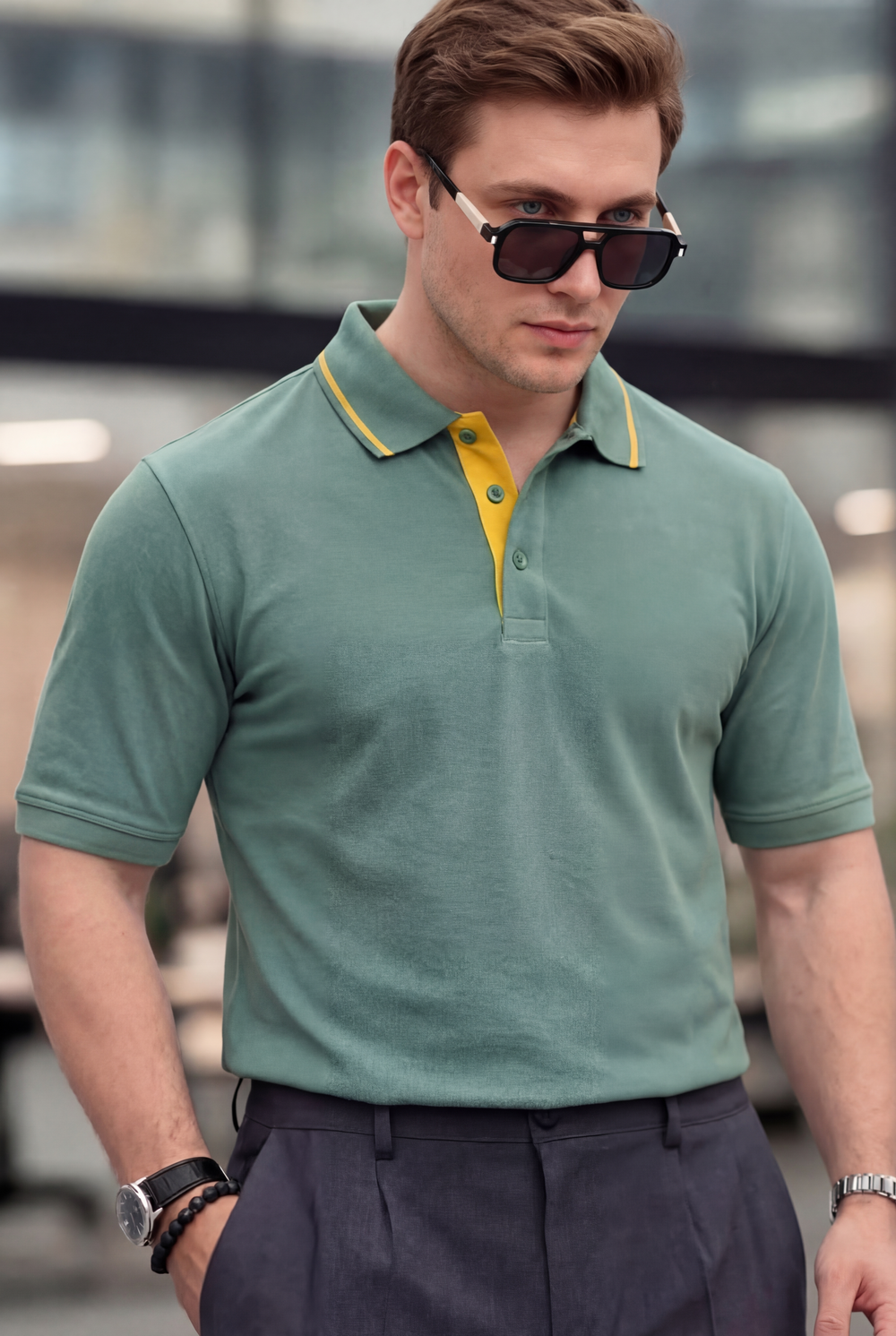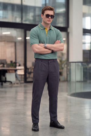 Встречайте современную классику — мужское поло трендового зелёного оттенка с яркими жёлтыми акцентами. Эта модель идеально подойдёт как для офисных встреч, так и для прогулок по городу.