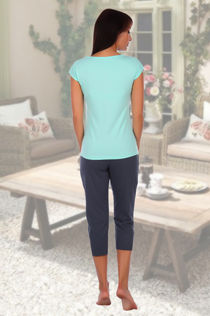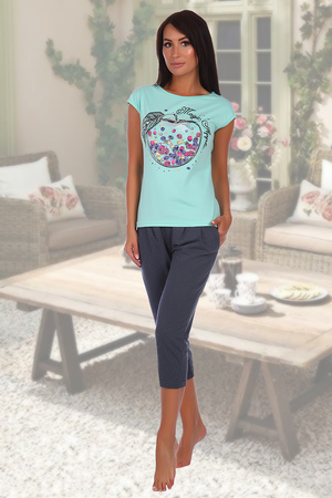 Костюм универсален: его можно носить дома, на любимой даче и как на дневной променад. Бриджи-капри заужены к низу, на поясе с широкой простроченной резинкой 3см. Свободный крой на уровне бёдер и живота, благодаря кокетке на поясе и складкам. Длина до середины икры. Благодаря хорошему составу 50% х\б и 50% п\э бриджи не растянутся на коленях. Футболка оформлена полноцветной печатью, поэтому ягоды кажутся натуральными. Горловина-лодочка. Очень удобный крой. Оттенок ткани бриджей может отличаться от представленного на фото