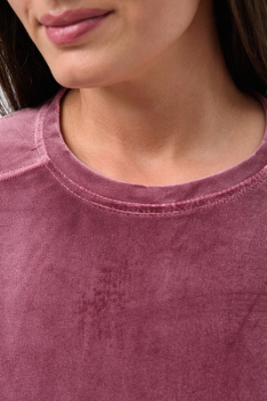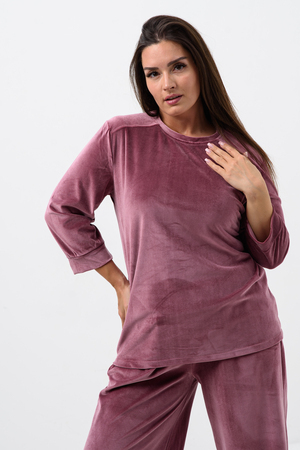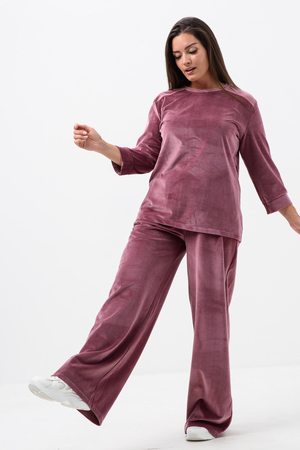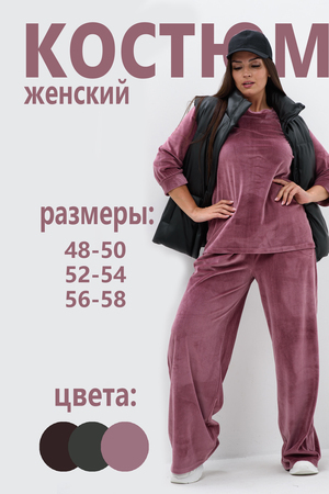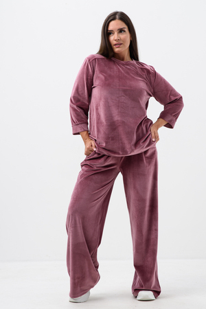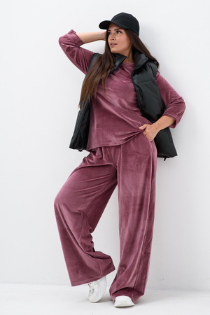 Костюм женский двойка штаны + кофта выполнен из плотной и мягкой ткани велюр. Брюки с карманами и поясом на резинке, у кофты округлый воротник и рукав 3/4 на манжете. Комплект прямого свободного силуэта, Идеального подходит для повседневной носки.