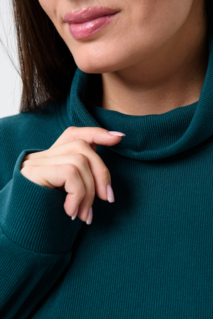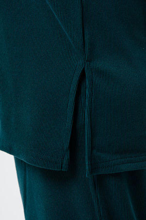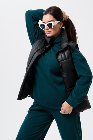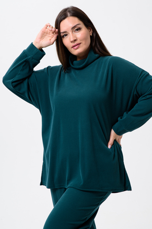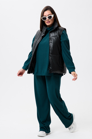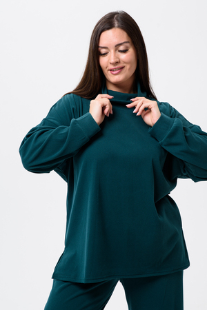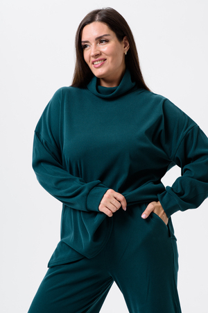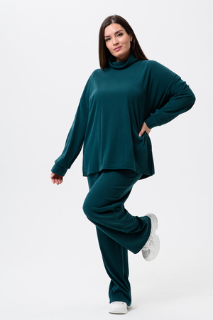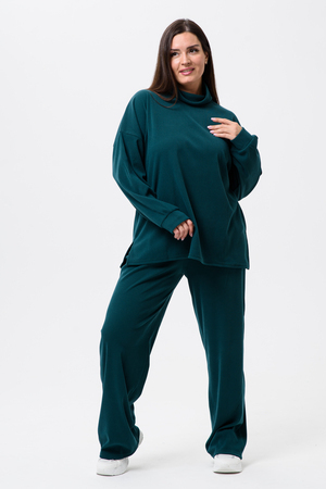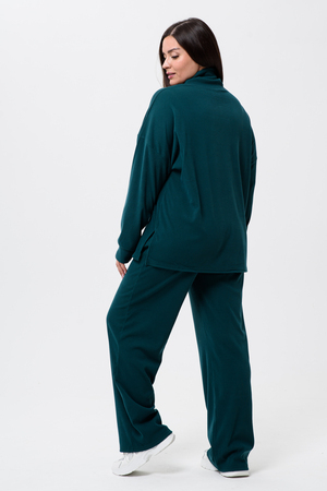 Женский костюм - двойка, выполнен из утепленной, мягкой, рельефной ткани. Верх - кофта, достаточно свободного кроя, рукав спущенный на манжете, горловина высокая, также можно носить раздельно от штанов, хорошо будет сочетаться с джинсами или с классическими брюками. Низ - свободные штаны палаццо, пояс на резинке, по бокам карманы. Костюм прекрасно подойдет для прогулок и работы, хорошо в прохладную погоду с жилеткой или пальто, идеально для вашего гардероба.