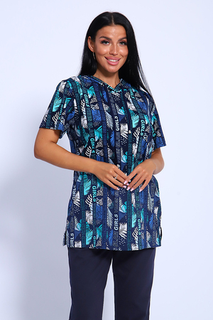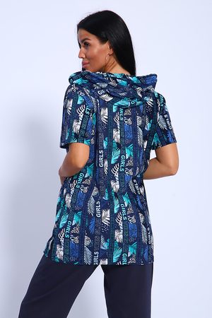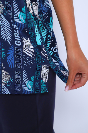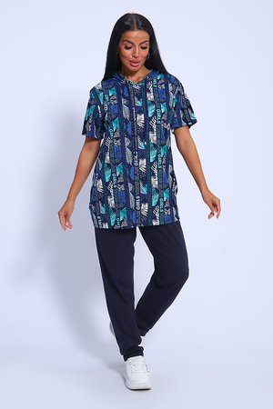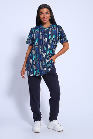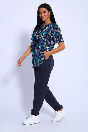 Стильный костюм из нежного хлопкового трикотажа выполнен из качественной ткани красивой расцветки с газетным принтом. Изюминкой костюма является сочетание однотонных темных брюк и яркой кофты. Костюм превосходно подходит для повседневной носки, прогулок и занятий спортом.