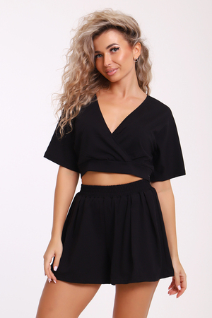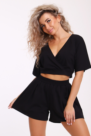 Костюм состоит из топа и шорт. Топ с лифом на запах и короткими цельнокроеными рукавами. Шорты свободного кроя и с высокой посадкой.