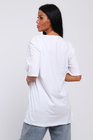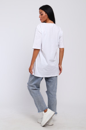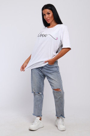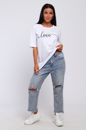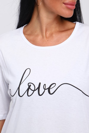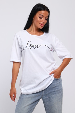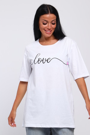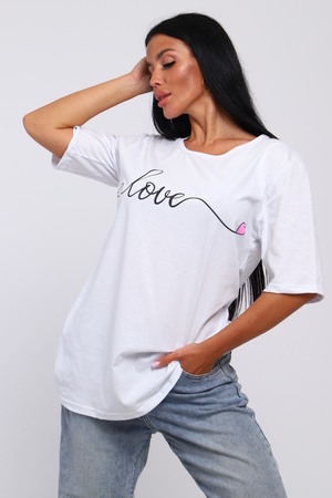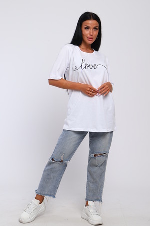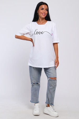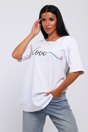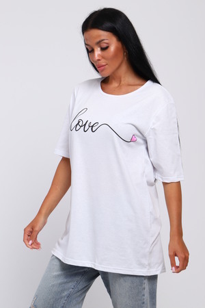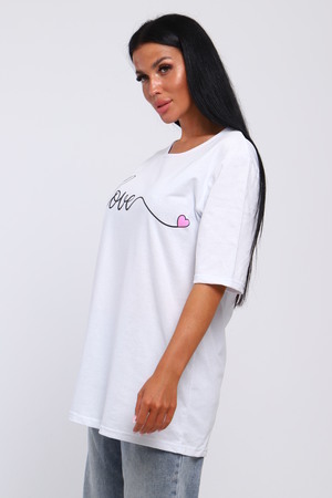 Футболка базовая из 100% хлопка. Свободный фасон прямого силуэта и рукав до локтя со спущенным плечом обеспечивают свободу движений. Крой oversize будет хорошо продаваться в любое время года. Широкий размерный ряд от 48 до 66 включает большие размеры. Качественный трикотаж и модный принт сердца подойдет любой аудитории от подростков для взрослых дам.