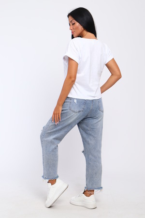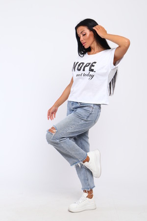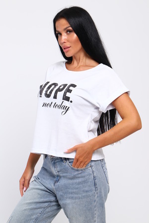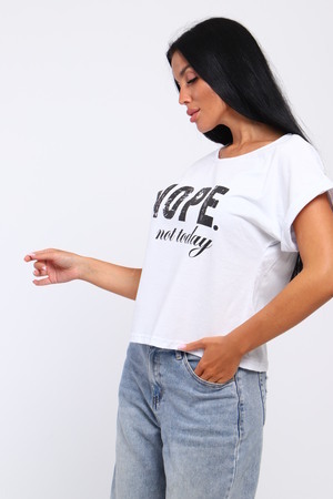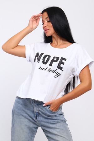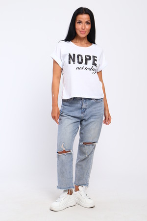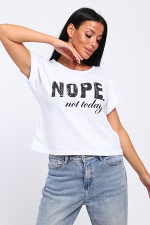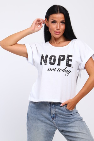Футболка женская укороченная со спущенным плечом, округлым вырезом горловины и широкими рукавами с подворотами. Свободный крой и оригинальная надпись «Nope» делает ее актуальной в любом сезоне лето, осень. Современный дизайн и оригинальный крой подойдет для девушек подростков и более взрослой аудитории. Состоит из 100% хлопка (кулирка).