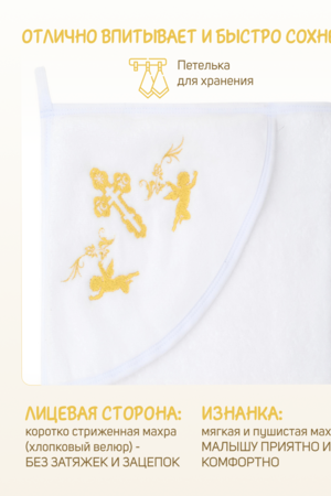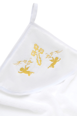 Детское крестильное полотенце с уголком махровое белое изготовлено из мягкого 100% хлопка, который подходит для новорожденных, не вызывает аллергии и отлично впитывает влагу. С лицевой стороны уголка - нежный хлопковый велюр (короткостриженая натуральная махра), с изнанки - мягкая петельчатая махра. Благодаря такой отделке уменьшается риск образования затяжек, а само полотенце выглядит дорого и благородно. Полотенце с капюшоном большого размера 90х100 см для детей с рождения до 5-6 лет позволяет укутать малыша полностью с макушки до пяточек. Удобный капюшон с вышивкой золотой нитью (православная тематика, ангелы) поможет быстро высушить волосы. Этот банный аксессуар с оригинальным дизайном, как мягкое махровое облачко, понравится всем членам семьи без исключения! Полотенце быстро впитывает влагу и подойдет для ванной. Махровая ткань отлично пропускает воздух, позволяя коже "дышать". Полотенце для мальчика и девочки подходит всем, кто подбирает товары для новорожденных, памятный подарок молодой будущей маме, на рождение ребенка, на годик, выписку из роддома, крестины малыша, внуку, внучке. Это банное махровое полотенце для новорожденного с уголком в идеальном исполнении: натуральное, функциональное и очень красивое!