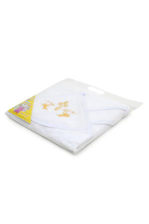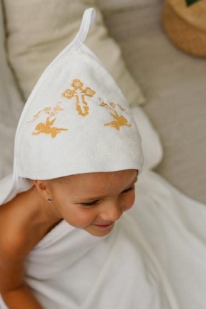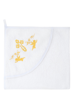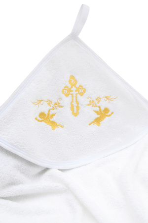 Детское крестильное полотенце с уголком махровое белое изготовлено из мягкого 100% хлопка, который подходит для новорожденных, не вызывает аллергии и отлично впитывает влагу. С обеих сторон полотенца - мягкая петельчатая махра. Полотенце с капюшоном большого размера 90х100 см для детей с рождения до 5-6 лет позволяет укутать малыша полностью с макушки до пяточек. Удобный капюшон с вышивкой золотой нитью (православная тематика, ангелы) поможет быстро высушить волосы. Этот банный аксессуар с оригинальным дизайном, как мягкое махровое облачко, понравится всем членам семьи без исключения! Полотенце быстро впитывает влагу и подойдет для ванной. Махровая ткань отлично пропускает воздух, позволяя коже "дышать". Полотенце для мальчика и девочки подходит всем, кто подбирает товары для новорожденных, памятный подарок молодой будущей маме, на рождение ребенка, на годик, выписку из роддома, крестины малыша, внуку, внучке. Это банное махровое полотенце для новорожденного с уголком в идеальном исполнении: натуральное, функциональное и очень красивое!