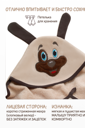 Милое детское махровое полотенце изготовлено из мягкого хлопка, который подходит для новорожденных, не вызывает аллергию и отлично впитывает влагу. Уголок с ушками — это идеальный вариант для ухода за младенцем. Снаружи - велюр, изнанка - махровые петли. Гипоаллергенный материал с натуральным хлопком в составе быстро сохнет и не вызывает раздражение чувствительной кожи лица и тела. Полотенце с капюшоном большого размера 90х100 см для детей с рождения до 5-6 лет позволяет укутать малыша полностью с макушки до пяточек. Текстильное изделие имеет капюшон, украшенный декоративной вышивкой. Удобный несъемный капюшон с забавной мордочкой держит тепло и помогает быстро высушить волосы. Этот банный аксессуар с оригинальным дизайном понравится всем членам семьи! С ярким смешным полотенцем с мордочкой животных кроха будет с удовольствием умываться и мыть руки самостоятельно. Его можно использовать каждый день как большое полотенце для купания в ванной и душевой кабине или для спортивных занятий по плаванию в бассейне. Подходит как крестильное полотенце, уголок сыну и дочери, любимому крестнику. Применяется как детский плед, хлопковое покрывало в кроватку и коляску, накидка для пляжа от солнечный лучей. Универсальное быстросохнущее полотенце-уголок понравится детям, подросткам и девушкам. Подойдет для ног, его можно повязать в виде тюрбана чалмы после мытья головы и душа дома или в бане. Полотенце для мальчика и девочки подходит всем, кто подбирает товары для новорожденных, памятный подарок молодой будущей маме, молодым родителям на рождение дочки и сыночка, на годик, крестины малыша, девочке на 8 марта, мальчику на 23 февраля, на именины, новоселье, подруге, сестре, внуку, внучке. Это многофункциональный предмет и незаменимый помощник для мамочек и детей для повседневного пользования. Красивый подарок на выписку из роддома для грудничка. Упаковка товара – плотная прозрачная сумка с ручками. Производитель махровой ткани для уголков - фабрика "Донецкая Мануфактура".
