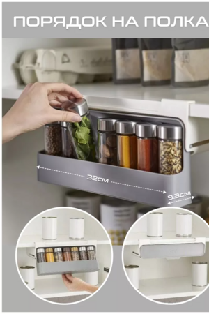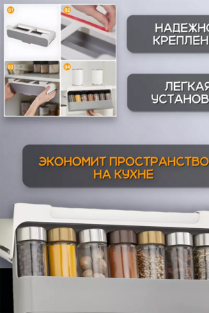 Подвесной органайзер для специй - отличное решение для организации хранения специй. Он выполнен из качественного полипропилена и отличается высокой прочностью. Благодаря своим свойствам, органайзер легко чистится, не впитывает пятна и запахи. Органайзер для специй оснащен выдвижным отсеком, в котором можно разместить до семи баночек. Это позволяет рационально использовать пространство в шкафу, экономя место на кухне. Кроме того, органайзер обеспечивает удобство в быстром извлечении и уборке специй. Этот подвесной органайзер также может использоваться для хранения других кухонных, аптечных или ванных принадлежностей, помогая сохранить место или создать свободное пространство. Установка органайзера - простая задача. Для этого необходимо очистить нижнюю часть полки, снять подложку с клейкой ленты, надеть крючки на край кухонной полки и плотно прижать органайзер в области ленты, удерживая его в течение 30 секунд. Органайзер готов к использованию через 24 часа после крепления.