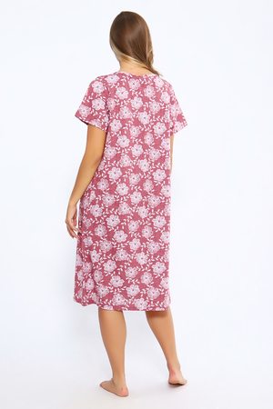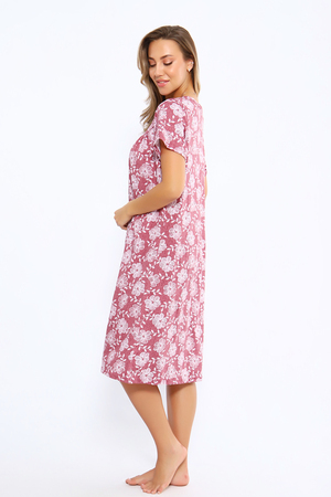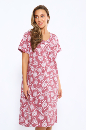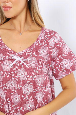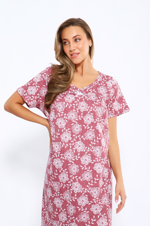 Сорочка свободного кроя с короткими рукавами. Полочка с отрезной кокеткой и сборкой над грудью. Вырез декольте украшен бантиком. Комфортна для повседневной носки и сна.
