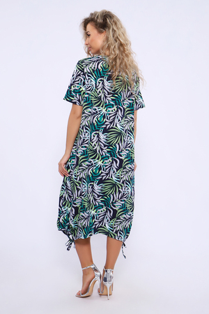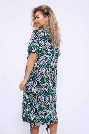 Платье свободного кроя с короткими рукавами и завязками внизу. В боковых швах удобные карманы.