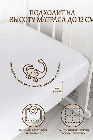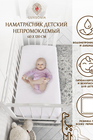Наматрасник непромокаемый детский c резинкой по периметру от бренда LUXSONIA. Слои наматрасника состоят из мембраны (непромокаемый слой), синтепон, верх наматрасника махра 80% хлопок, 20% пэ. Высота бортика 15 см. Чехол на матрас прекрасно защитит поверхность матраса от влаги и загрязнений. Фирменная резинка обеспечивает хорошую фиксацию. Легок и прост в использовании, рекомендуемая температура стирки 30 С. Наматрасник имеет паропроницаемую мягкую "дышащую" поверхность. Гипоаллергенен. Постельное белье на нем не скользит. Состав: мембрана (непромокаемый слой), синтепон, верх наматрасника махра (80% хлопок, 20% пэ)