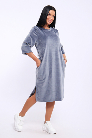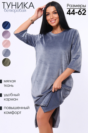 Туника женская мягкая велюровая, полуприлегающего силуэта. Вырез горловины округлой формы, обработан обтачкой из основной ткани. Туника с карманами и разрезами в боковых швах, длина чуть ниже колена. Рукав втачной, длина чуть ниже локтя. Для более облегающего силуэта вы можете взять данную модель на размер меньше. Туника имеет большой размерный ряд.