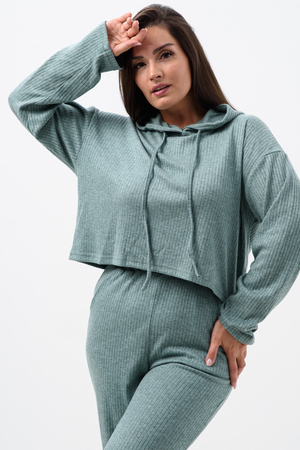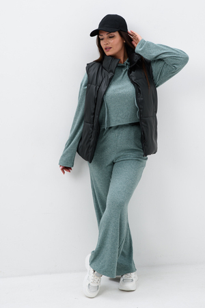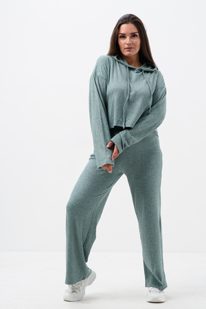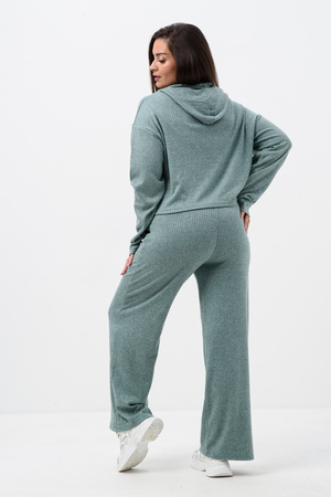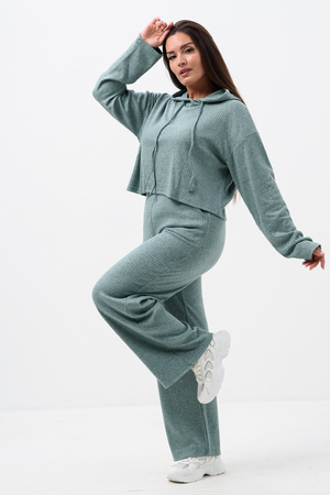 Женская двойка, изготовленная из приятной и плотной ткани - ангорка-лапша. Кофта костюма с капюшоном на шнурках, и длинным спущенным рукавом, свободные брюки палаццо с высокой посадкой и мягкой резинкой на поясе. Данная модель подойдет для прогулок и для дома, она достаточно уютная и комфортная, хороший выбор для вашего гардероба.