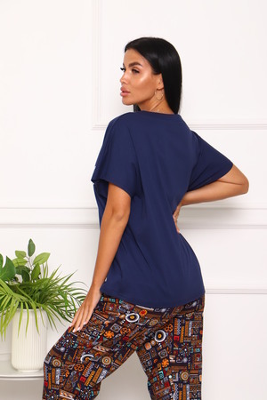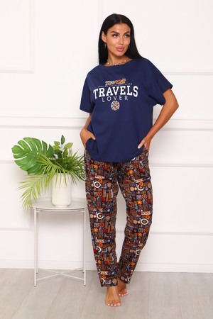 Костюм женский состоит из футболки и брюк. Костюм выполнен из трикотажного полотна кулирка. Кофта свободного силуэта на полочке выполнена печать. Брюки-чиносы слегка заужены к низу, по бокам имеются карманы, пояс на резинке.
