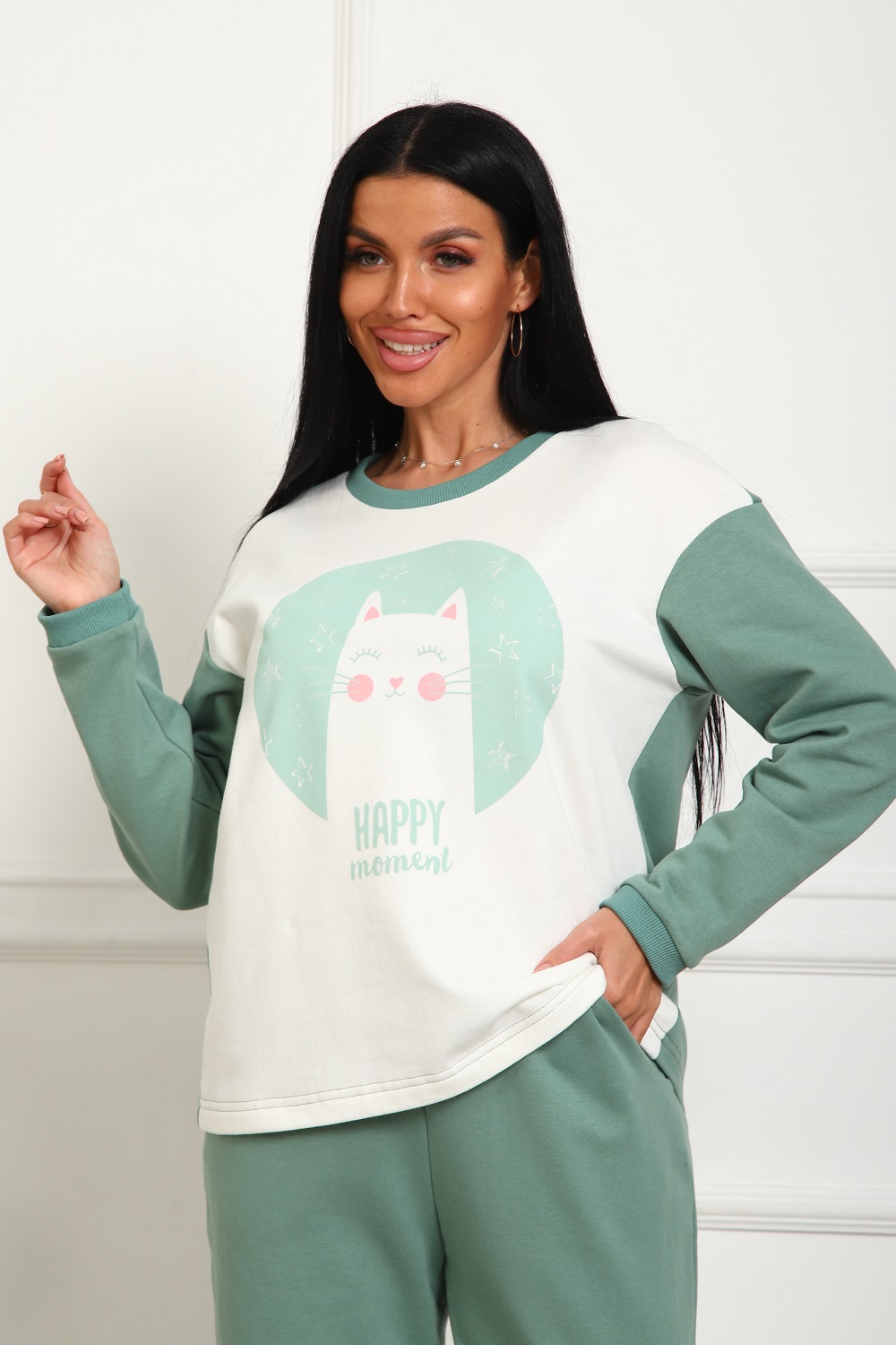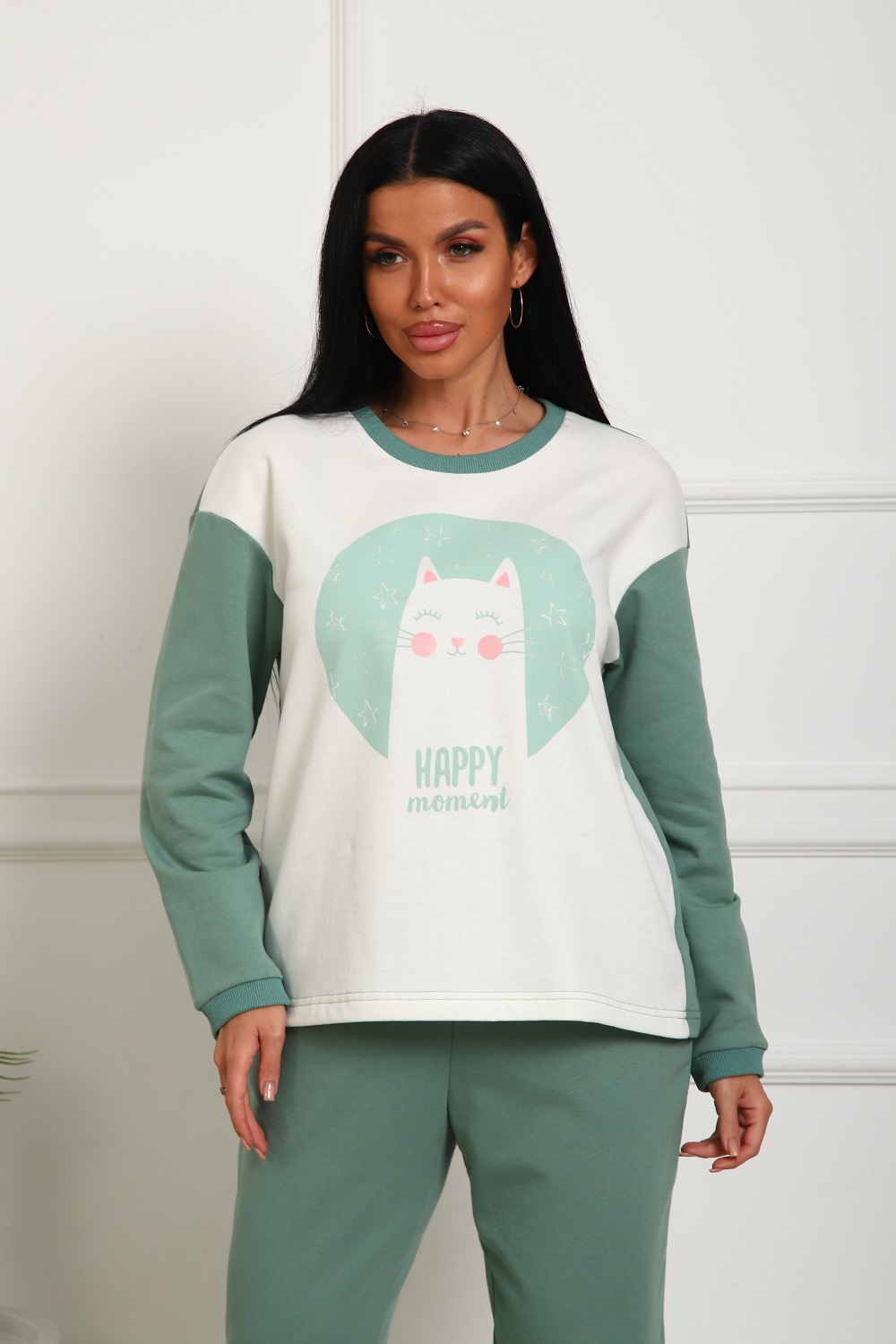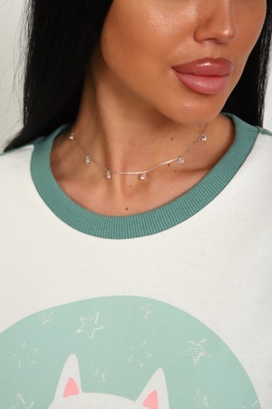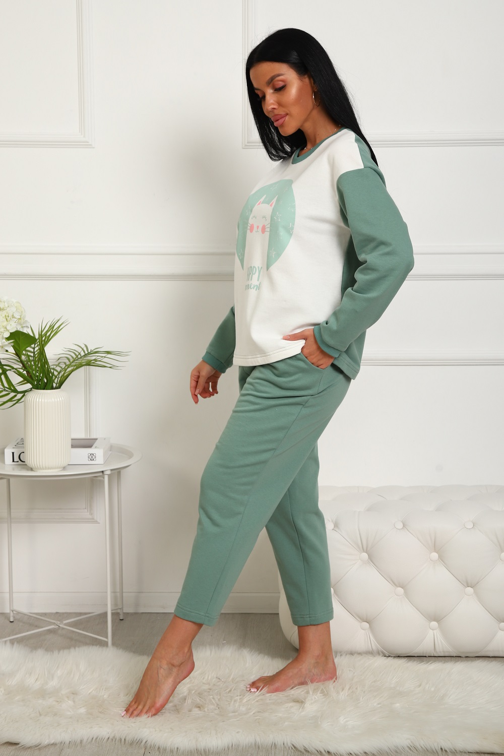 Пижама женская теплая: футболка прямого кроя со спущенным плечом и милым принтом на груди, бриджи "бананы" с карманами в боках. Комфортный хлопковый трикотаж - футер 2-нитка с начесом на изнаночной стороне.