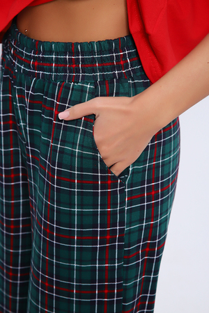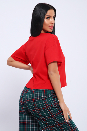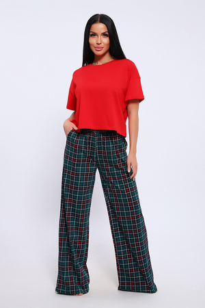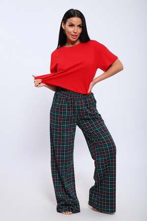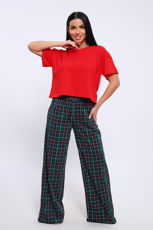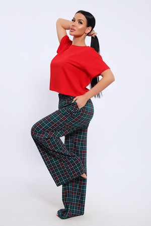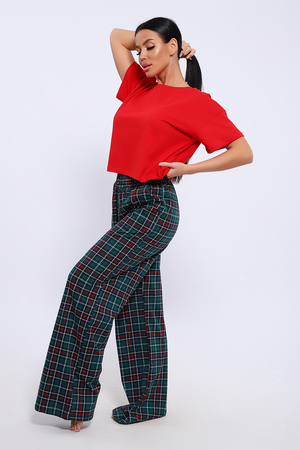 Домашняя женская пижама их мягкого хлопка. Свободная футболка прямого кроя, со смещенными плечевыми швами. Вырез горловины округлой формы с обтачкой. Длина футболки укорочена выше линии бедер, что является трендом сезона. Широкие брюки прямого кроя с высокой посадкой, с вместительными боковыми карманами, пояс на резинке с декоративной отстрочкой и атласным милым бантиком. Длина брюк стандартна, чуть ниже щиколотки.