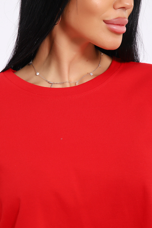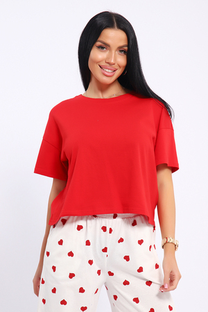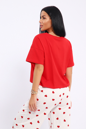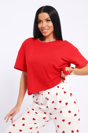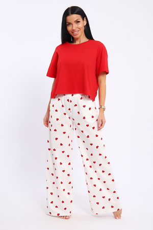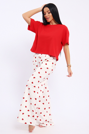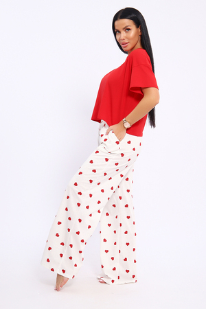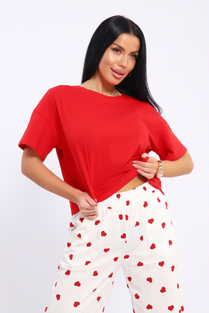 Домашняя женская пижама их мягкого хлопка. Свободная футболка прямого кроя, со смещенными плечевыми швами. Вырез горловины округлой формы с обтачкой. Длина футболки укорочена выше линии бедер, что является трендом сезона. Широкие брюки прямого кроя с высокой посадкой, с вместительными боковыми карманами, пояс на резинке с декоративной отстрочкой и атласным милым бантиком. Длина брюк стандартна, чуть ниже щиколотки.