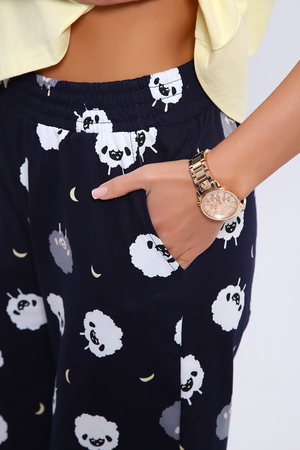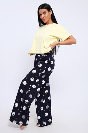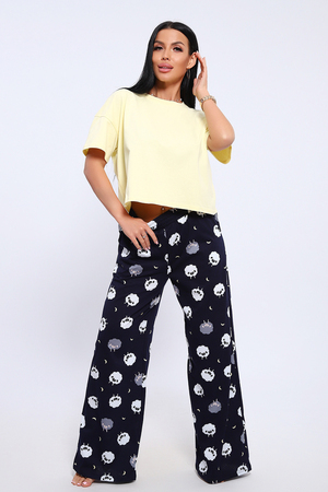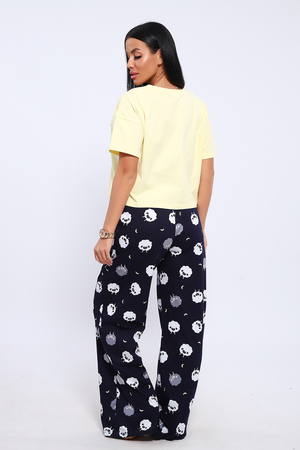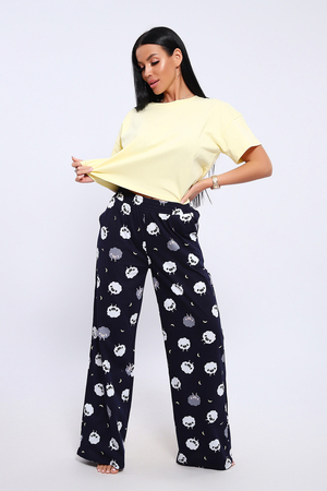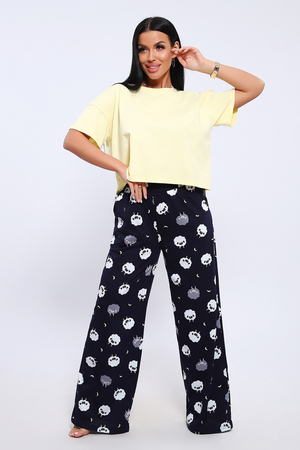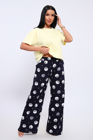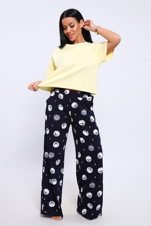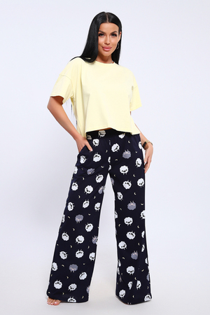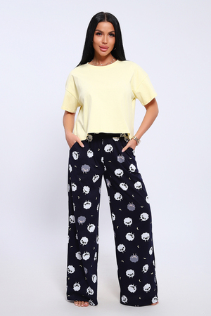 Домашняя женская пижама их мягкого хлопка. Свободная футболка прямого кроя, со смещенными плечевыми швами. Вырез горловины округлой формы с обтачкой. Длина футболки укорочена выше линии бедер, что является трендом сезона. Широкие брюки прямого кроя с высокой посадкой, с вместительными боковыми карманами, пояс на резинке с декоративной отстрочкой и атласным милым бантиком. Длина брюк стандартна, чуть ниже щиколотки.