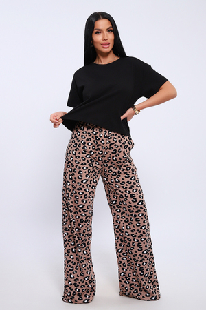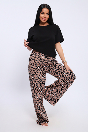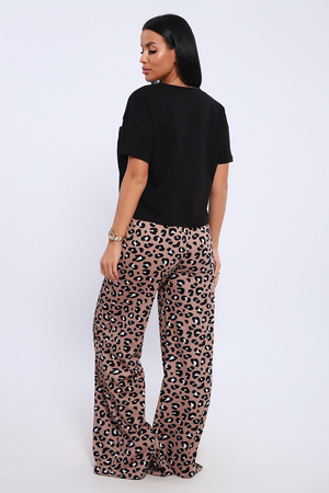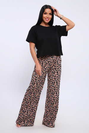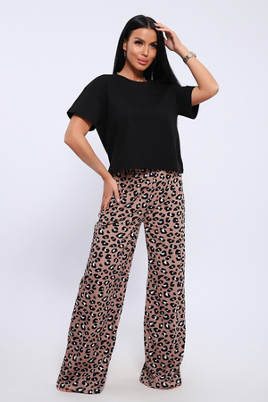 Домашняя женская пижама их мягкого хлопка. Свободная футболка прямого кроя, со смещенными плечевыми швами. Вырез горловины округлой формы с обтачкой. Длина футболки укорочена выше линии бедер, что является трендом сезона. Широкие брюки прямого кроя с высокой посадкой, с вместительными боковыми карманами, пояс на резинке с декоративной отстрочкой и атласным милым бантиком. Длина брюк стандартна, чуть ниже щиколотки.