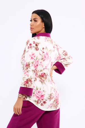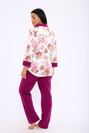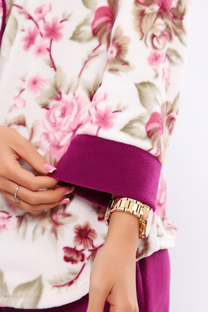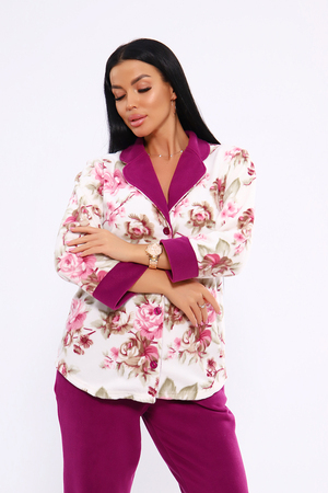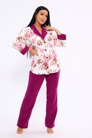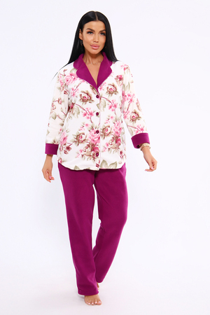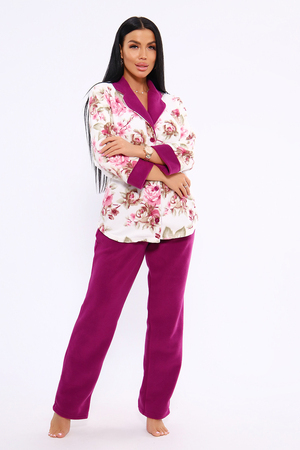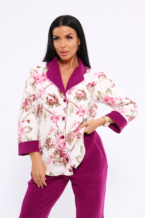 Домашний женский костюм из мягкого, теплого флиса. Кофта полуприлегающего силуэта, застегивается на петли и пуговицы. Длиной до бедер с фигурной линией низа. Рукав втачной, длиной 3/4 с манжетом из отделочной ткани. Воротник пиджачного типа с закругленными углами, из отделочной ткани. Борта, воротник и лацканы отстрочены. Домашние брюки прямого кроя с вместительными карманами в боковом шве, комфортный пояс на резинке, располагается на линии талии, длина брюк ниже щиколотки.