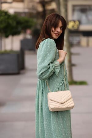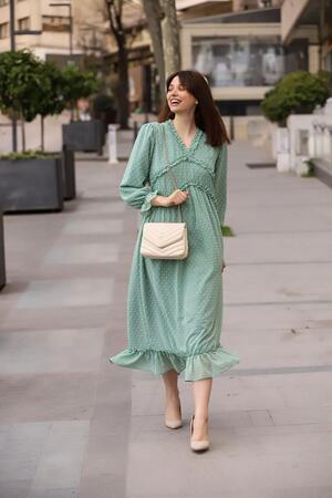 Это восхитительное шифоновое платье женское обладает волшебным сочетанием изящества и удобства. Оно нежно обволакивает фигуру, создавая легкий воздушный образ, который подчеркивает женственность и элегантность его обладательницы. А принт в горошек делает вас и необычной. Его струящаяся юбка ниже колена с силуэтом трапеции подарит вам изысканный силуэт, легко подчеркивая вашу грацию при каждом движении. Длинные рукава и V образный вырез делают его довольно закрытым, шифон окутывает вас таинственной аурой, оставляя место для фантазии. Оно идеально подходит как для повседневных выходов, так и для особых случаев. В нем вы можете смело отправиться на работу, и будете стильной и модной, а затем легко преобразить офисный наряд, добавив яркие аксессуары или каблуки, чтобы встретиться с друзьями в ресторане, пойти в театр или отправиться на праздничную танцевальную вечеринку. Вполне уместно будет выглядеть на свадьбе на маме или подружке невесты. И на любом торжестве или юбилее.