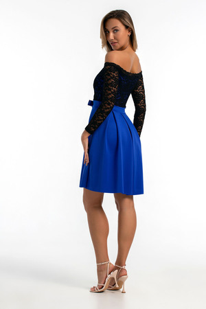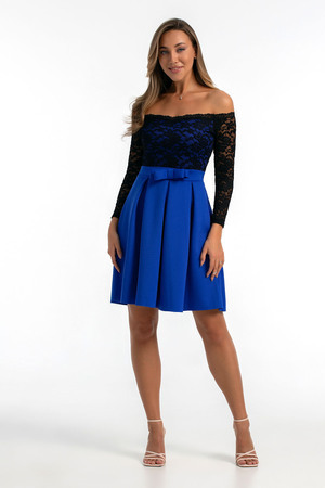 Утонченное приталенное платье длины мини с открытыми плечами с рукавами и нежным прилегающим лифом из кружевной ткани, а также струящейся юбкой со складками и декоративным бантиком на талии, выполненное из приятной к телу однотонной ткани.