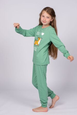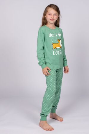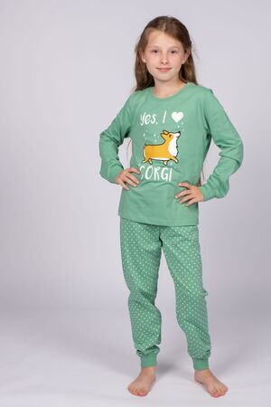 Пижама для девочки, состоящая из джемпера и брюк. Джемпер прямого силуэта с втачным длинным рукавом. Горловина круглая, обработана воротником из рибаны. По горловине полочки и спинки отделочная строчка. По низу рукавов манжеты из рибаны. Низ изделия обработан швом в подгибку. На полочке принт ШЕЛКОГРАФИЯ. Надпись переводится как "Да, я люблю корги". Брюки для девочки прямого силуэта, из набивного полотна. Пояс цельнокроеней, с эластичной тесьмой внутри. По низу изделия манжеты из рибаны.