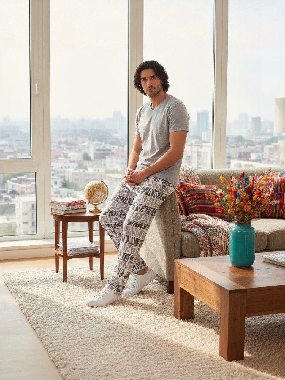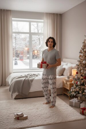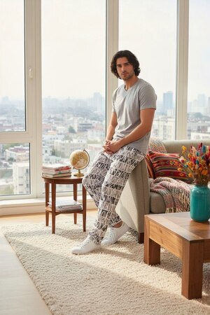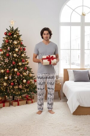 Стильный мужской костюм для дома и отдыха. Состоит из брюк свободного кроя, с резинкой на поясе и кармашками по бокам, а также футболки. Костюм отлично садится по фигуре и выглядит красиво. В нем комфортно и удобно заниматься домашними делами, встречать гостей или носить как пижаму. Самый практичный вариант домашней одежды на прохладное время года.