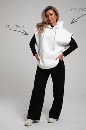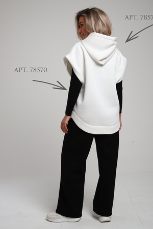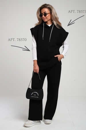 Женские широкие брюки, прямого силуэта, с притачным поясом внутрь которого вставлена эластичная резинка шириной 5см. Передние половинки с карманами. Боковые швы со смещением на перед к низу. По среднему шву передних и задних половинок расположена отстройка. Низ брюк подогнут. Брюки сшиты из футера 3-х нитки с начесом. Данная модель отлично сочетается с жилетом под номером 78573 и лонгсливом, образуя монохромный комплект на ваш вкус. А актуальность представленных брюк позволит вам подобрать к ним самые уютные и теплые образы в холодное время года. Материал устойчив к истиранию, выцветанию, сминаемости за счет этого,  вы всегда будете иметь аккуратный и ухоженный вид, так же не будет вытягиваться в коленях и локтях. При первых носках ворс может скатываться и оставаться на белье, это проходит после 1-2 стирки. На фото модель представлена в 48 размере.