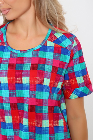 Туника полуприлегающего силуэта с короткими рукавами с манжетами. Спинка с отрезной кокеткой и встречной складкой посередине. У туники полукруглый низ с удлиненной спинкой. Карманы в боковых швах.
