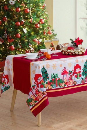 Материал рогожка, из которого изготовлена скатерть, обеспечивает ее прочность и долговечность. 100% хлопок делает скатерть приятной на ощупь и удобной в использовании. Красный цвет скатерти и яркие изображения снеговиков, елок и снежинок добавят в ваш интерьер яркости и волшебства.