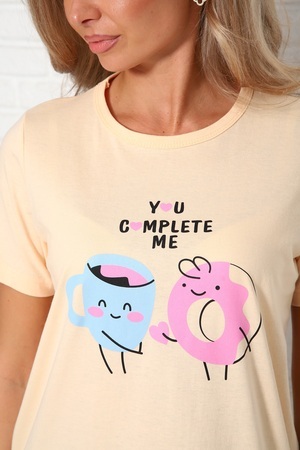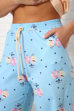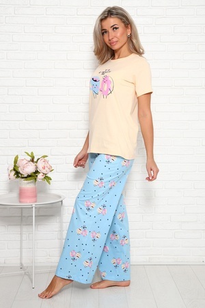Пижама женская: футболка с короткими рукавами и очаровательной печатью на полочке, брюки-палацио на эластичном поясе, с боковыми карманами. Роскошный силуэт и комфорт хлопкового трикотажа.
