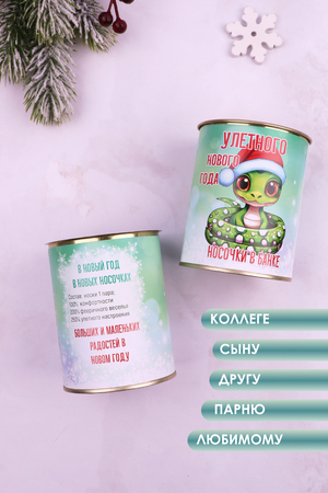Ищете идеальный подарок для мужчины на Новый год? Тогда обратите внимание на наши мужские носки в новогодней тематике! Внутри каждой банки вас ждёт приятный сюрприз — одна пара тёплых и уютных носков.