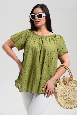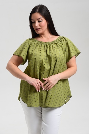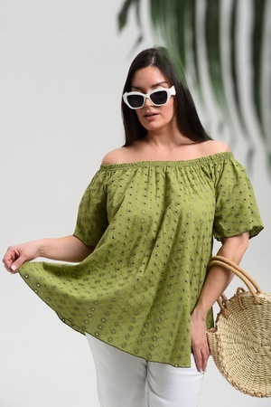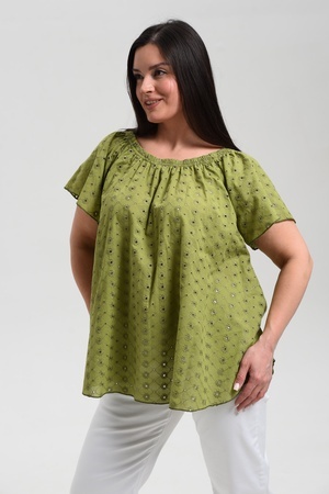 Туника женская, силуэт трапеция. Рукав реглан, короткий. Горловина собрана на эластичную тесьму. Низ туники фигурный. В лекалах учтена незначительная усадка ткани после стирки.