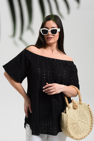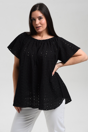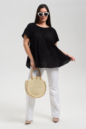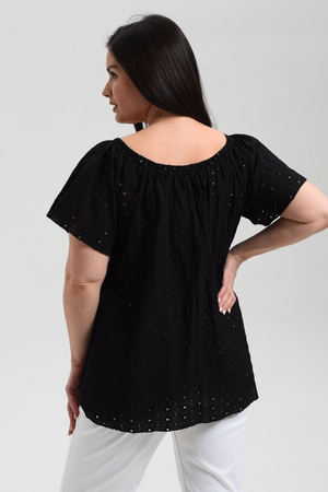 Туника женская, силуэт трапеция. Рукав реглан, короткий. Горловина собрана на эластичную тесьму. Низ туники фигурный. В лекалах учтена незначительная усадка ткани после стирки.