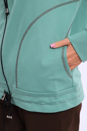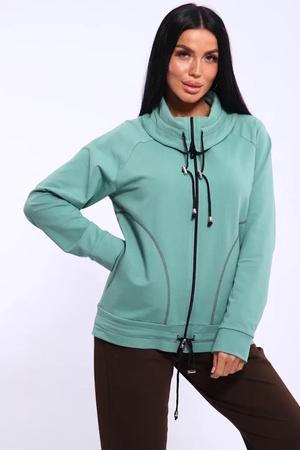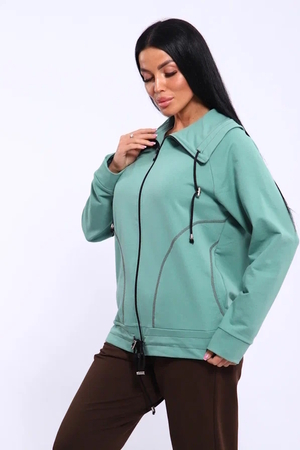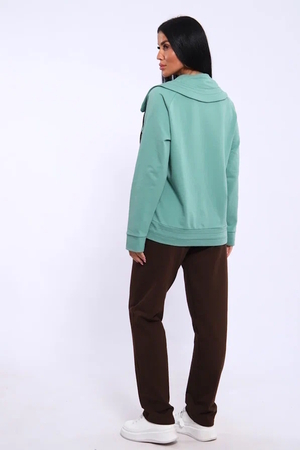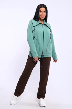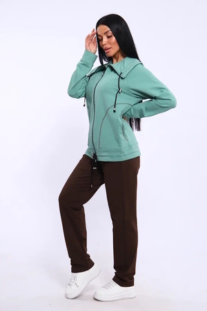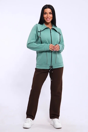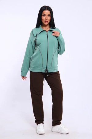 Спортивный женский костюм из эластичного футера. Брюки классического кроя без карманов на притачном поясе. Декоративный элемент в виде фиксаторов по дизайну не подбирается, может отличаться от представленного на фото.
