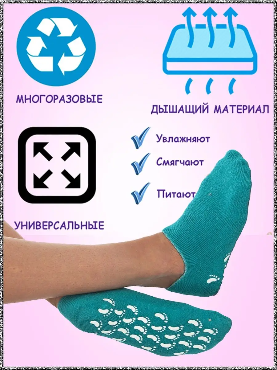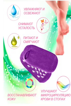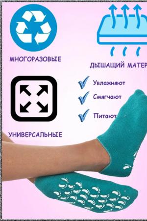 Увлажняющие SPA носки для педикюра будут ухаживать за ножками, пока вы будете отдыхать! Теплые и мягкие носочки очень приятно пахнут и расслабляют после тяжелого рабочего дня. С помощью геля создается эффект бани - кожа распаривается и пропитывается витамином Е, эфирными маслами жожоба, лаванды и оливы. Гелевый комплекс масел питает, увлажняет кожу, заживляет трещинки и раны, делает кожу более упругой, снимает отечность и уничтожает вредные бактерии, обладая антибактериальным эффектом. Также он способствует отслаиванию ороговевших слоев кожи. Надевайте женские отшелушивающие носки всего 30 минут в день, чтобы вернуть к жизни уставшие и сухие ступни, ослабленные ногти, провести мягкий пилинг пяткам и придать им мягкость. Короткие сеансы домашнего ухода не мешают, их можно оставлять на ночь как маску для пяток. Педикюрные носки многоразовые, 1 пара хватает для множества применений. Для создания эффекта бани рекомендуется предварительно нанести увлажняющий крем на ноги. Ткань у укороченных носочков плотная, но эластичная, и размер универсальный, подходящий для взрослых женщин, молодых девушек и девочек. Конечно же, это просто хит для уставших мам :). У силиконовых носков приятная ощупь махровая ткань, а резинка сжимает ножку. Они заменяют парафинотерапию. Чтобы избежать пересыхания, рекомендуется хранить их в холодильнике. Также их можно аккуратно стирать в прохладной воде (до 30°C) с мылом, без выворачивания наизнанку. Позаботьтесь о красоте и здоровье своих ног с помощью этих увлажняющих носков. Они станут отличным дополнением к вашему ритуалу маникюра и педикюра. Цвет в ассортименте