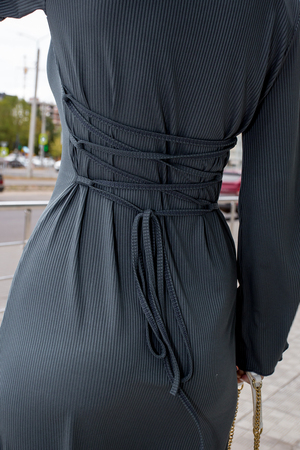 - Длинные расклешенные широкие рукава добавляют изысканности обтягивающему платью в рубчик и гармонично завершают композицию.