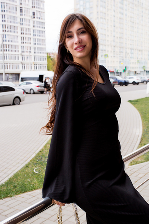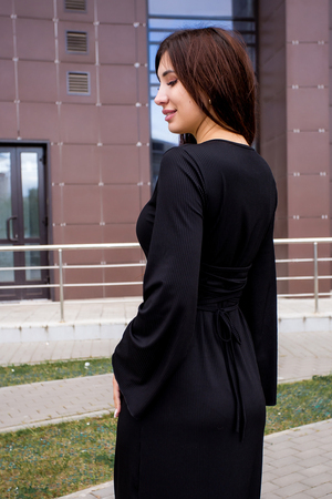 - Длинные расклешенные широкие рукава добавляют изысканности обтягивающему платью в рубчик и гармонично завершают композицию.