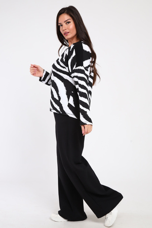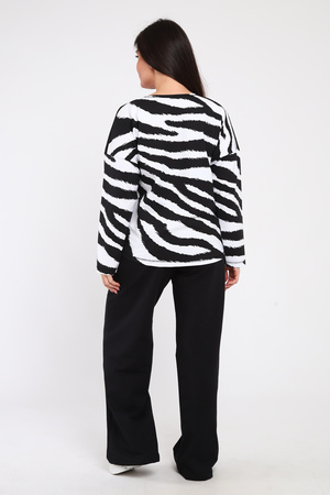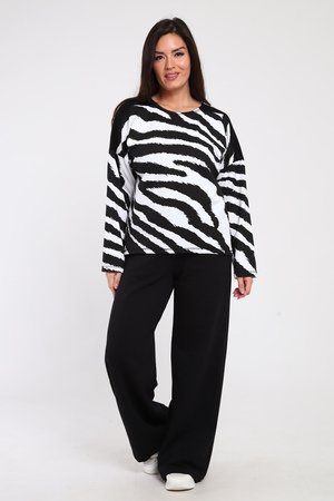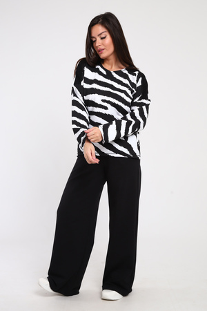 Трикотажный женский костюм предназначен для девушек, ценящих комфорт, удобство и спортивный стиль. Он имеет свободный крой, который подходит для тех, кто предпочитает свободные вещи. Джемпер со спущенным рукавом. Штаны клеш в стиле палаццо с карманами имеют завышенную посадку и визуально вытягивают фигуру, что особенно актуально для невысоких и полных девушек. Модель подчеркивает фигуру и скрывает все недостатки. Подойдет для прогулок в кино с друзьями, путешествий, работы в офисе, праздника, а также как вечерний модный образ на свидание.