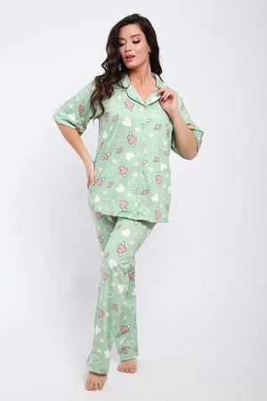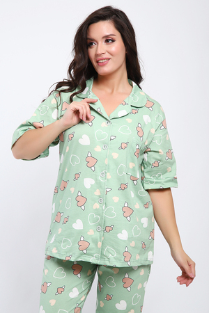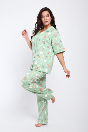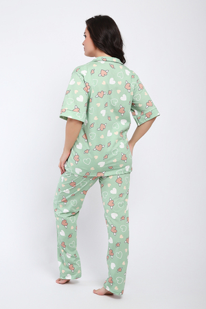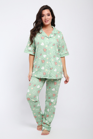 Женская пижама состоит из рубашки и брюк. В этом ансамбле вы найдете все - трендовая расцветка, идеальная посадка, широкий размерный ряд. Рубашка свободного покроя застегивается на 5 пуговиц, на груди накладной карман. Брюки прямого покроя с карманами по бокам. Выглядеть прекрасно дома - это просто.